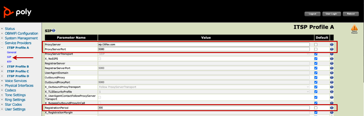 1. Select the associated ITSP Profile (we used profile "A") and configure the following options: