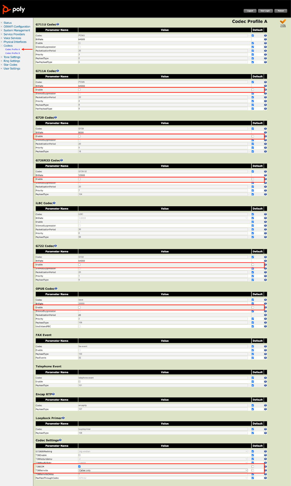Finally, navigate to the “Codecs” menu and select the “Codec Profile A” sub-menu. Scroll to the bottom of this menu, and find the "Fax Event" section. Enable this by unchecking the default box and checking the enable checkbox. Then, under the "Codec Settings" section, you will need to set the following: