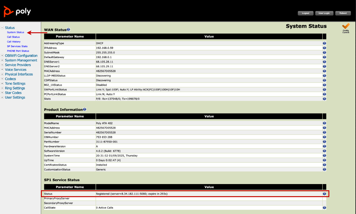 After submitting your final changes and rebooting, check the “System Status” page (under the “Status” menu) and see that SP1 is registered: