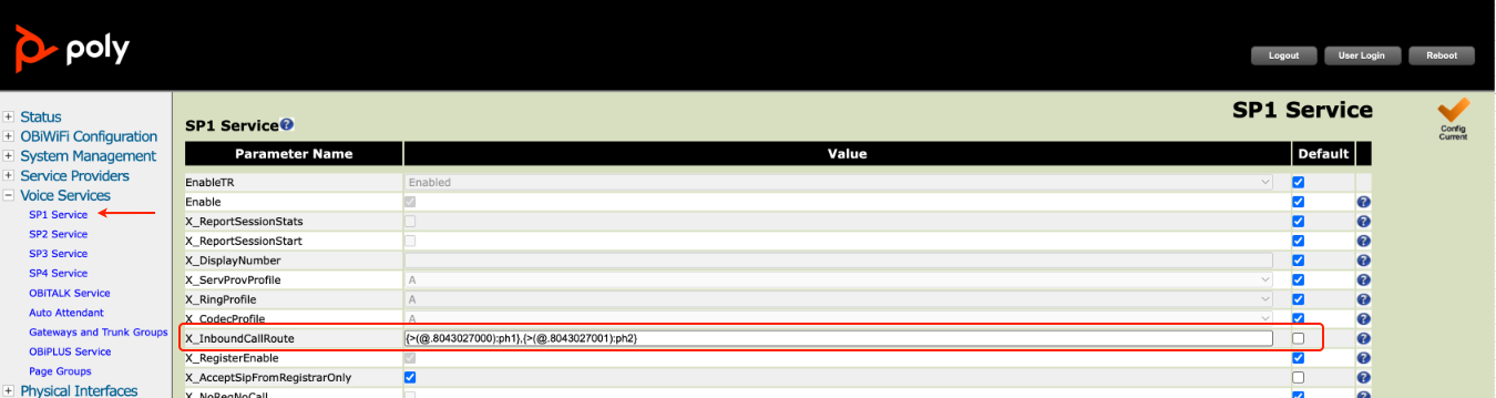 2. Select the SP Service that corresponds to the ITSP Profile above (we used SP1 Service in this example). Configure the inbound call route to recognize the called number, and route the call to the appropriate Physical Interface port (e.g., ph1, ph2). As a reminder, we’re using the following numbers in our example—18043027000 & 18043027001—with the number ending in 7000 being the primary number on this trunk used for registration.