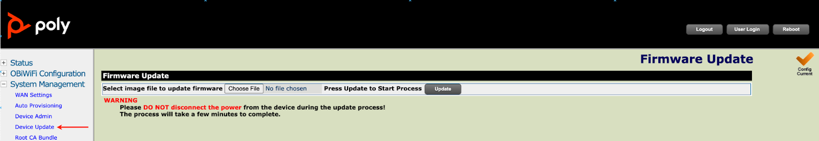 Please upgrade your firmware to the newest version available. See the currently recommended firmware in the link above. Once downloaded, navigate to “System Management” and select “Device Update.” From here, click “Choose File” under firmware update to select the previously downloaded file. Finally, click the “Update” button.