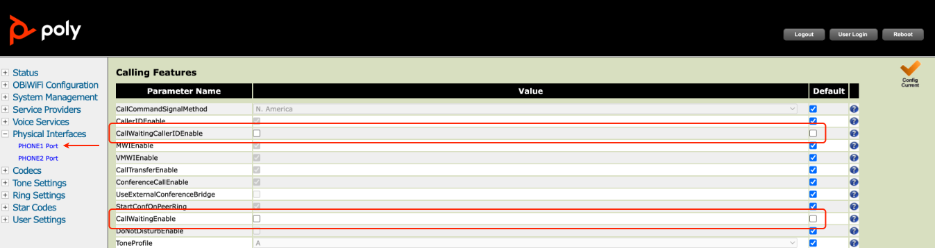 Next, navigate to the “Physical Interfaces” menu and select “PHONE1 Port” and find the “Calling Features section” and disable the following: