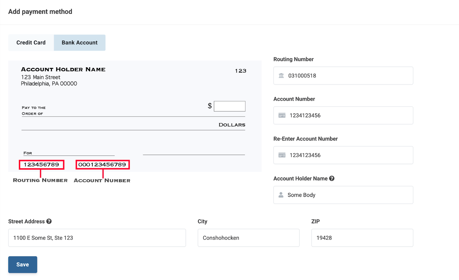 To get started, you’ll need to define a credit card or bank account saved payment. Choose either the Credit Card or Bank Account tab, complete the form, and save the payment method.